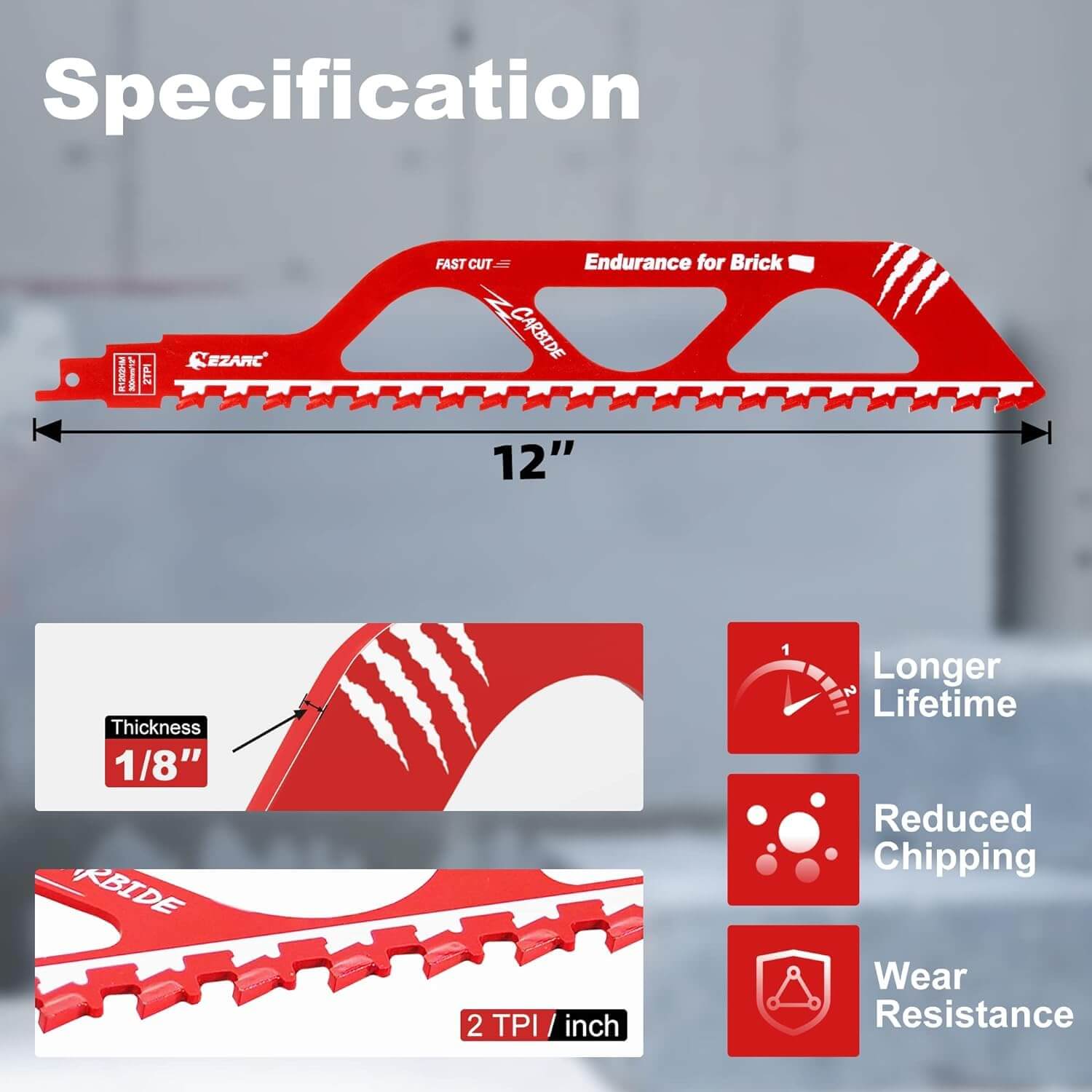 The EZARC 12-Inch Reciprocating Saw Blade is designed for efficient, clean, and versatile cutting with minimized dust creation. It is perfect for cutting red bricks, hollow bricks, gypsum boards, drywalls, plaster, plastics, porous concrete (aerated concrete), hollow concrete, cement composite boards, tree branches, and (nail-free) wood. Featuring a large tooth pitch (2 TPI), this blade ensures accurate and easy cuts. Constructed with a bi-metal blade and tiny carbide teeth, it offers exceptional durability, heat resistance, and impact resistance for long-lasting performance. Designed for high precision cutting, the carbide teeth handle highly abrasive mineral-based materials, while the large tooth pitches provide quick and precise edges. Engineered for extreme cutting in high-performance applications, this blade is ideal for construction, renovation, and demolition work.